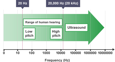 Ultrasound waves have a frequency higher than the upper limit for human hearing – above 20,000 Hertz (Hz). Different species of animal have different hearing ranges. This explains why a dog can hear the ultrasound produced by a god whistle but humans cannot.