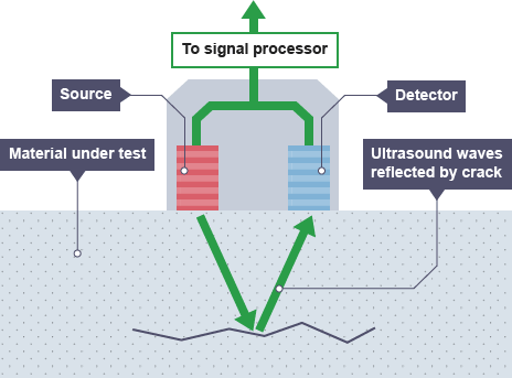 - the time taken for the waves to leave a source and return to a detector is measured.