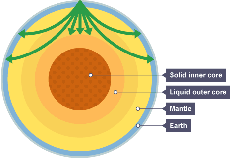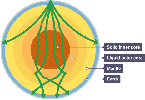 Seismic waves from large earthquakes are detected around the world. Their paths are curved as the waves refract due to the gradually changing density of the layers.
