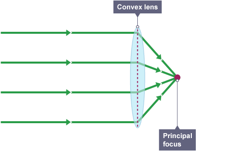A convex lens is thicker in the middle that it is at the edges. Parallel light rays that enter the lens converge. They come together at a point called the principal focus.