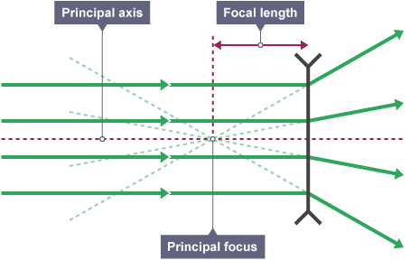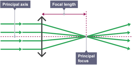 In a ray diagram, a convex lens is drawn as a vertical line with outward facing arrows to indicated the shape of the lens. The distance from the lens to the principal focus is called the focal length.