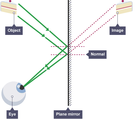 Reflection from a smooth, flat surface is called specular reflection. This is the type of reflection that happens with a flat mirror. The image in a mirror is: