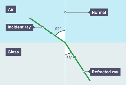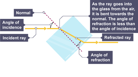 Glass is denser than air, so a light ray passing from air into glass slows down. If the ray meets the boundary at an angle to the normal, it bends towards the normal.